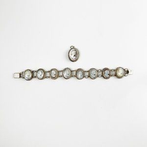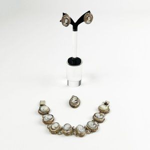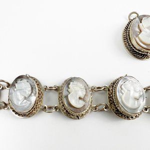 Vintage Silver Abalone Shell Cameo Set Bracelet Earrings Pendant Parure