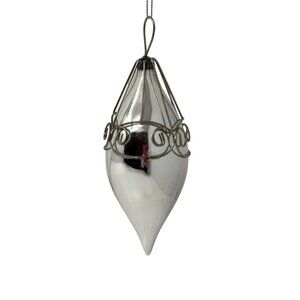 Vintage Silver Blown Glass Teardrop Christmas Ornament Wire Cage Mercury Finish