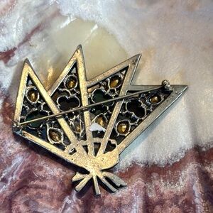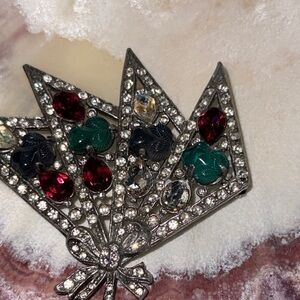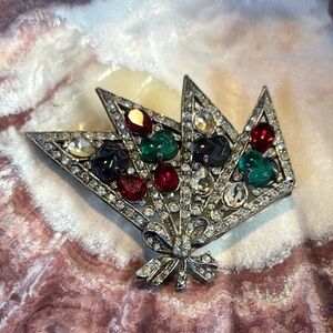 Vintage RARE Large Figural Fan Brooch, Molded Fruit Salad Stones & Rhinestones Elegant brooch featuring vibrant red and green stones. Set in a silver-tone metal. Adds a touch of vintage charm.