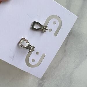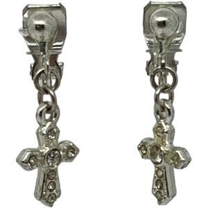 These vintage clip-on earrings feature a delicate silver-toned cross charm with small jeweled accents. The crosses dangle from the clip-on posts, creating a graceful, feminine look.