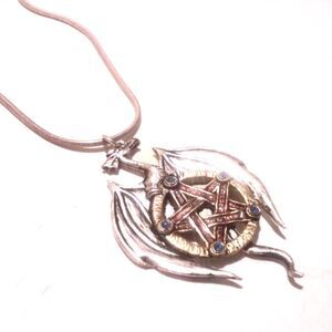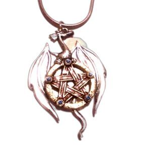 This captivating vintage necklace features a bold dragon pendant with intricate detailing, designed in a silver finish with the look of pewter. The dragon holds a rhinestone-tipped enamel star, adding a touch of mystique and charm. Measuring approximately 2" in length and 1 3/8" in width, the pendant is marked ER 2000 on the back, highlighting its vintage appeal.