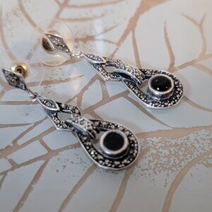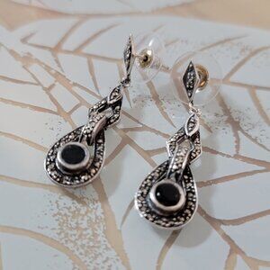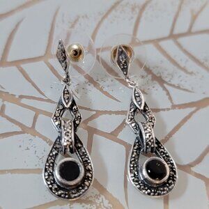Vintage Silver Earrings Filigree Drop Dangle With Black Gem Sparkly