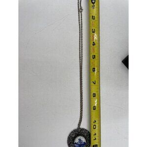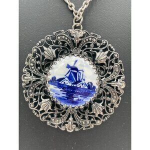Vintage Silver Filigree Pendant Necklace Blue Delft White Windmill Porcelain Des