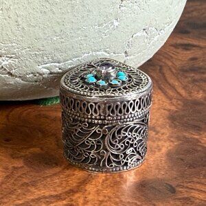 Vintage Silver Filigree Teardrop Trinket Box With Turquoise + Amethyst