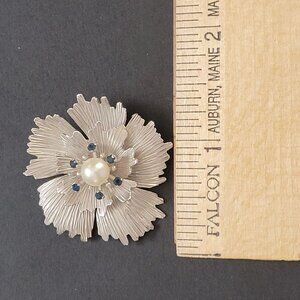 Vintage Silver Flower Brooch With Pearl & Blue Gemstones Retro Floral Pin Jewelr