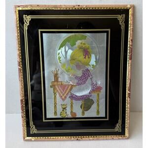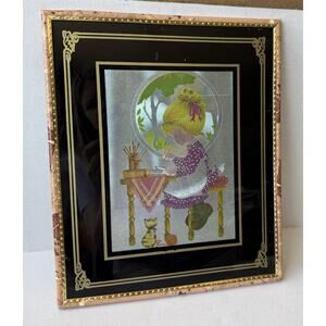 Vintage framed Dufex foil style art print sealed with a textured plastic frame. Depicts the “Sarah Kay” character, a young girl at her desk writing by a window with a cat and ball of yarn at her feet.