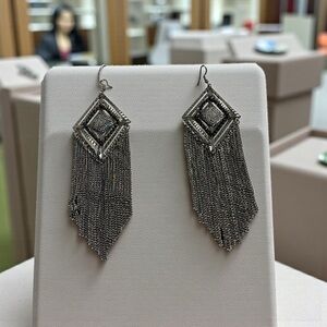 Vintage silver geometric dangle earrings with chain fringe. Perfect for adding a touch of sophistication to any outfit. In good condition. Earrings Length 7 inches. Ships fast!