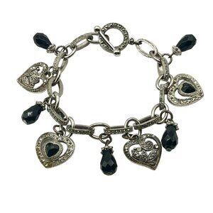 Vintage Silver Glitz Heart Charm Bracelet Black Crystal Bead Charms Y2K Glam