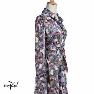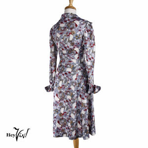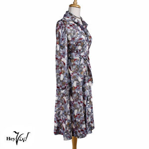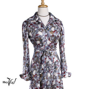 Vintage Silver Grey Floral Print Dress w Long Sleeves Tie Belt Size M - Hey Viv
