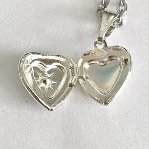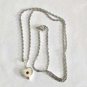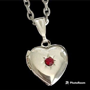 Vintage Silver Heart Locket Necklace Dainty Small Charm 18" Plated Red Stone