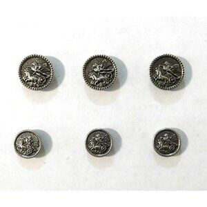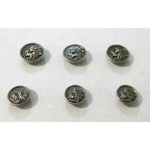 Add a touch of history to your attire with this exquisite set of six antique-style buttons. Featuring a dramatic design of a charioteer and horse, these buttons are captivating relics of a time when intricate storytelling adorned even the smallest details. Perfect for restoration projects, costumes, or creative crafting, this set includes three smaller buttons measuring 0.5 inches and three medium buttons at 0.75 inches. The detailed craftsmanship and silver-tone finish make these buttons a timeless accessory to elevate your creations.