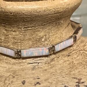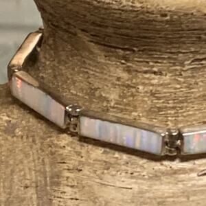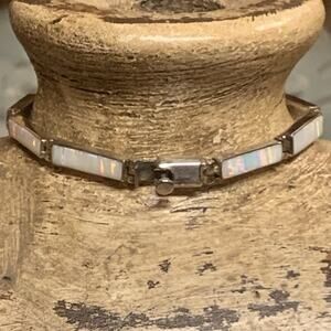 This vintage silver bracelet from Mexico features an opal inlay in a rectangular shape, making it a unique and beautiful piece of jewelry for special occasions. The push lock closure and 6-inch length make it suitable for small wrists. Handmade with a linked style, this bracelet is a unique and original piece that exudes beauty and elegance. Perfect for engagements, weddings, anniversaries, birthdays, or any special day, this bracelet is a timeless piece that will be cherished for years to come. Marked Mexico