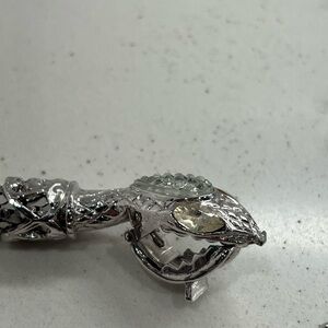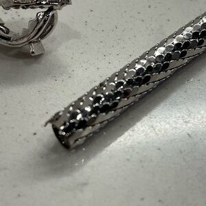 The Vintage Silver Mesh Snake Necklace/Belt is a unique and stylish piece of jewelry that features a snake design with crystal eyes. It’s signed and made in the United States, adding to its authenticity and charm. The silver color and white crystals create a striking accessory, making it a statement piece that is sure to turn heads. This original vintage item is a perfect addition to any jewelry collection for those who appreciate one-of-a-kind designs inspired by animals and insects. Tail end appears to be missing but doesn’t affect the use.