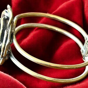Add a touch of romance and vintage charm with this stunning silver-tone floral cuff. The raised rose detail has subtle brass undertones that add dimension and warmth. A beautiful statement piece for boho, romantic, or vintage-inspired looks.