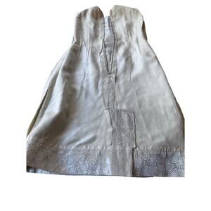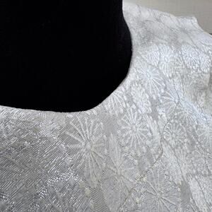The true color was difficult to photograph. It appears to be silver with a tint of gold. I photographed under lights, and outside. Please see the interior shots too. The hem looks to have been altered. Uncertain if this was a custom made dress. Truly unique.