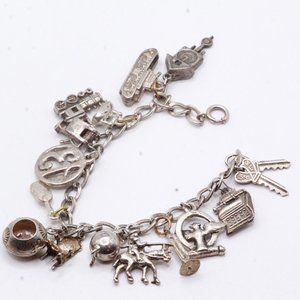Step back in time with this exquisite vintage bracelet, meticulously crafted from sterling silver and adorned with 13 unique charms, including a charming mix of keys, a tanker, typewriter, and a train, among others. This delightful piece has been tested and verified to be sterling silver, with some links crafted from brass for added detail. The spring ring clasp ensures a secure and comfortable fit, with a total length of 6 1/2 inches. This beautiful bracelet is in pristine condition and weighs 35 grams, making it a true treasure for any collector or lover of vintage jewelry. Experience the timeless beauty and craftsmanship of this stunning piece, where each charm and link tells its own story.