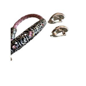 This elegant vintage set includes a braided pink leather bracelet and matching silver earrings, both adorned with intricate designs and gemstones.