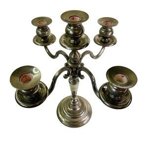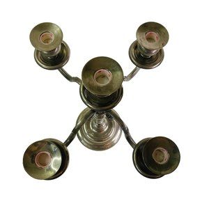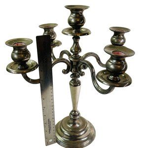 Vintage silver-plate metal candelabra. Holds 5 taper candlesticks. It stands 14.5" tall and measures 13" across at the arms. It is in very nice condition overall but is does have some light corrosion, mostly where the candle holders fit onto the plates below them. The inside of the candle holders has some red waxy residue from previous candle use. This piece will make a nice wedding table decoration or add a touch of elegance to your holiday table. It is quite heavy.