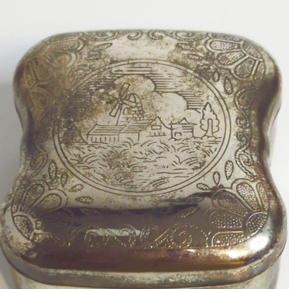 This vintage silver trinket box showcases intricate engravings of a windmill scene, exuding timeless charm and craftsmanship from a bygone era. (FC04)
