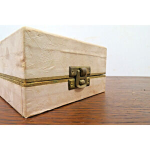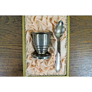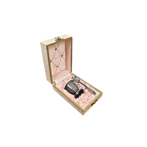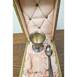 This is an adorable little vintage baby spoon and cup set. These are silver plated and in a box. The box interior has ruffled pink fabric and an exterior latch. The egg cup and spoon show signs of age and could be polished. The box is 6" x 4" and 2.5" tall.