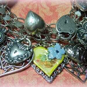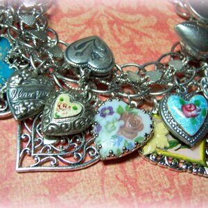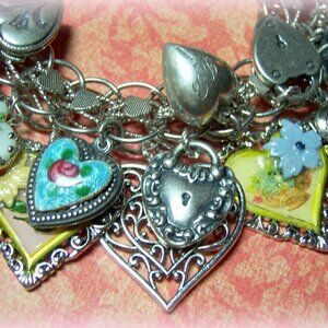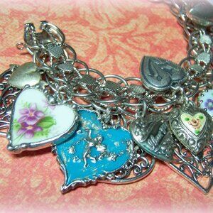 Offered for sale is a puffy heart charm bracelet with 25 charms on a vintage Monet silver-plated charm bracelet. The vintage silver bracelet is 7". The charms are a mixture of sterling silver, silver plated, rhodium plated, and white metal. Also included are two broken china charms and several guilloche hearts. Several charms are attached with jump rings, which the new owner may want to have soldered or epoxied by a jeweler for added security. This is a very unique bracelet.