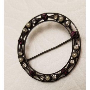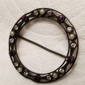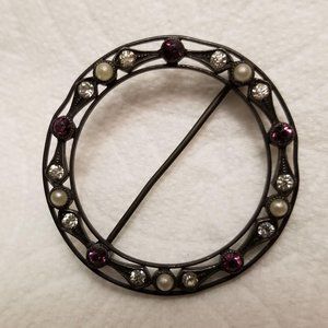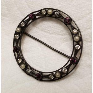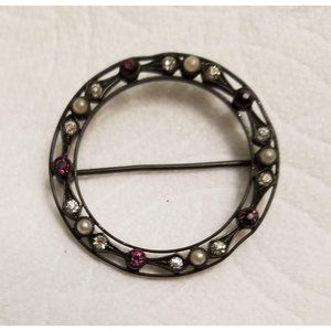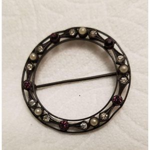 Vintage Silver Rhinestone Pearl Brooch Pin Round Antiqued Scarf Hat SC402