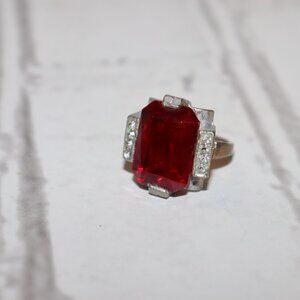 🔥 A striking vintage ring featuring a deep red glass gemstone in a bold emerald cut—flanked by clear accent stones and set in a silver-tone band with timeless charm. The adjustable fit (6–8) makes it perfect for gifting, stacking, or spotlighting in a glam bundle.