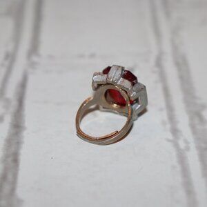 🎁 Boutique details: • Vintage silver-tone ring · Adjustable 6–8 • Red glass gemstone · Emerald cut • Clear accent stones · Ornate setting • Excellent condition · No flaws • Ships wrapped in boutique style with care