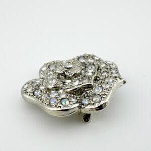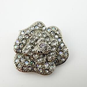 Vintage Silver Rose Brooch Aurora Borealis Rhinestone Flower Pin