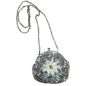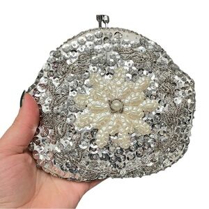vintage clutch, sequin bag, evening bag, floral design, elegant accessory, handmade clutch, 1960s fashion, classic clutch, statement piece, formal wear, special occasion, glamorous clutch, timeless fashion, unique handbag, kisslock, kiss lock sequin bag, mini bag, micro bag, coin pouch, retro style, dazzling accessory, formal bag, silver sequin