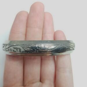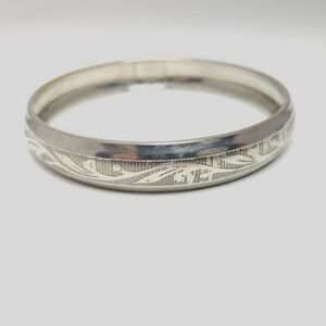 Vintage Silver Tone Bangle Bracelet with Scroll Leaf Design on Side, Stacking