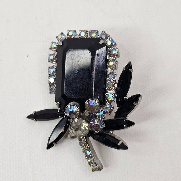 Vintage Silver Tone Black AB Rhinestone Brooch Aurora Borealis Open Back