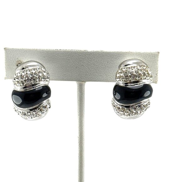 Elegant vintage clip-on earrings featuring a stunning silver tone metal base accented with black enamel and sparkling clear rhinestones. These retro-style earrings offer a bold, classic look perfect for special occasions or everyday glam. Designed with secure clip-on backs, ideal for non-pierced ears. A timeless addition to any vintage jewelry collection.