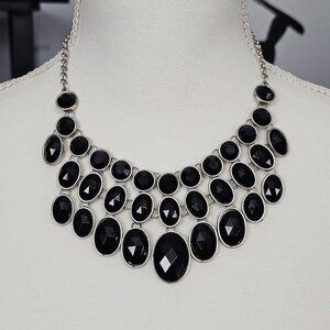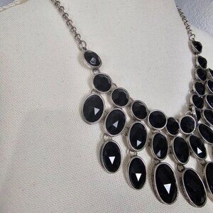 Vintage Silver Tone Black Faceted Multi Stone Chunky Bib Statement Necklace