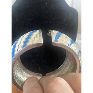 Vintage Silver Tone, Blue and Cream Enamel Spring Loaded Bracelet