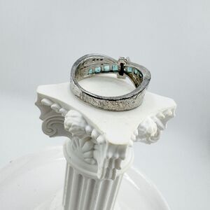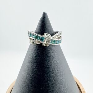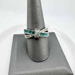 This vintage 1990s silver-tone bow-style ring features green glass baguettes set in a sculpted crossover design accented with sparkling marcasite rhinestones. Its Art Decoinspired symmetry and romantic ribbon motif give it a timeless elegance, blending vintage sophistication with subtle modern shimmer.