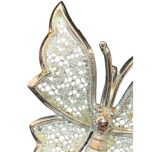 This vintage silver tone butterfly brooch features delicate filigree wing detailing, offering an elegant accent for formal attire or accessory collections.