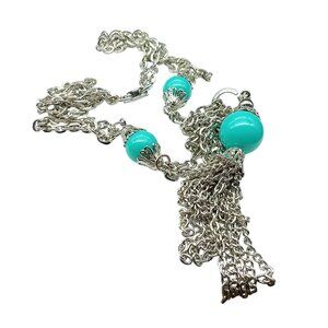 Vintage Silver Tone Chain Necklace with Turquoise Lucite Beads & Tassel Pendant
