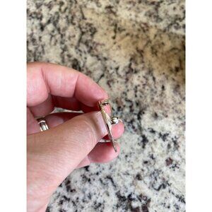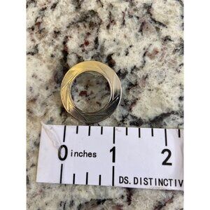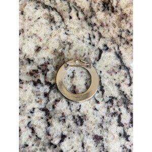 Elegant vintage silver-tone brooch featuring a minimalist circular design with etched diagonal detailing. The clean, geometric style captures mid-century modern elegance — perfect for accessorizing blazers, scarves, or coats. Ideal for collectors of vintage costume jewelry and lovers of understated sophistication.
