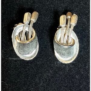 Vintage silver-tone clip-on earrings marked “PAT PEND” on the back. These mid-century earrings feature an oval base with dangling tassel elements and a textured design. Great statement pieces for fans of retro or MCM (Mid-Century Modern) jewelry. Light wear consistent with age. Clip mechanisms work properly.