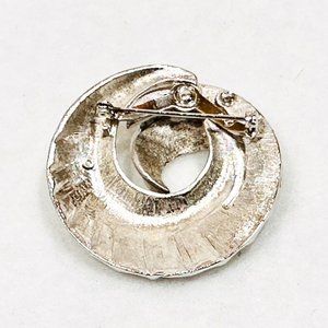 Vintage Coro brooch pin with a swirl/wave/seashell type pattern. Textured matte and high polished finish. Pin stem runs horizonally at the "top" of the pin and secures with a rollover catch.