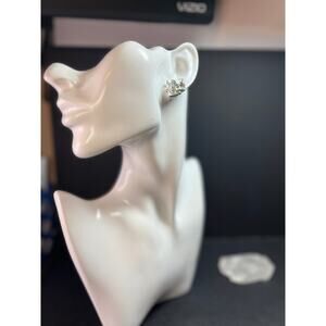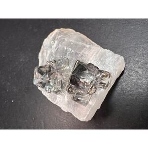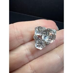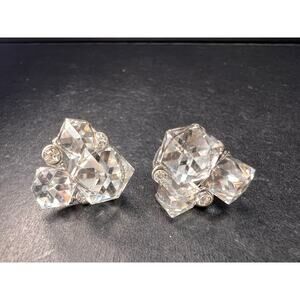 Pre owned, excellent condition. These vintage silver-toned costume earrings feature three sparkling faceted crystal-glass cubes in graduated sizes, accented by small round rhinestones for extra shimmer. The cluster design catches light from every angle, giving them a bold, dimensional look that feels both retro and modern. Post-back style with comfortable stability discs included. Perfect for special occasions, evening wear, or adding a little glam to everyday outfits.