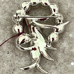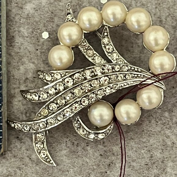 This vintage silver tone filigree brooch with rhinestones and faux pearl accents is a stunning piece of fashion jewelry. Featuring a round shape, this brooch is adorned with white/colorless rhinestones and a faux pearl center. With a diameter of 2 inches, this original vintage piece exudes elegance and charm, making it a perfect accessory for any outfit or occasion. Its intricate design and high-quality materials make it a timeless and eye-catching addition to any jewelry collection.