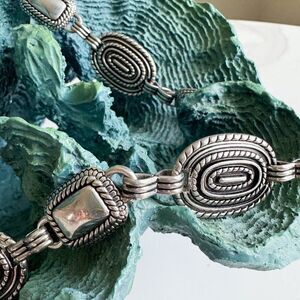 Vintage women’s belt with silver tone geometric chain links and adjustable fit.