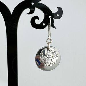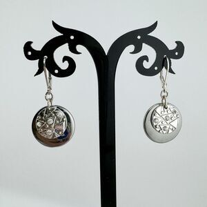 Discover the beauty of this unique pair of vintage dangle earrings. The circular design features intricate geometric patterns & sparkling accents, creating a captivating & modern look. The silver tone finish adds a touch of elegance & versatility, making these earrings perfect for any occasion. Embrace your boho chic style & elevate your look with these stunning earrings.