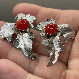 Vintage Silver Tone Grape Leaf Clip On Earrings w/ Red Cabochon Stones