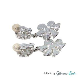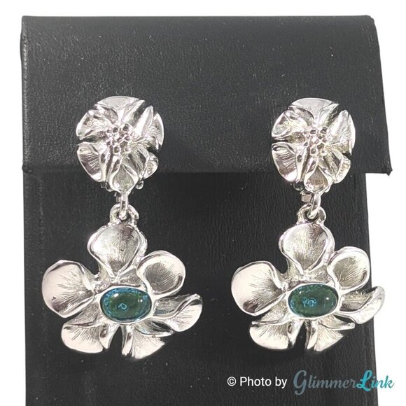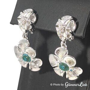 Vintage floral dangle clip on earrings crafted in silver tone metal, designed with wavy petals that create a soft, dimensional look. Each earring features a sculpted flower stud that suspends a larger blossom below, giving them graceful movement when worn. The center of the lower flower is accented with an oval green cabochon, adding a pop of color and vintage charm.