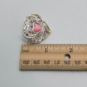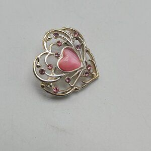 A sophisticated heart-shaped brooch designed with elegant filigree metalwork and delicate embellishments. The centerpiece features a soft pink cats eye stone surrounded by intricate silver-toned metallic scrollwork and pink rhinestone accents, creating a refined and feminine accessory.