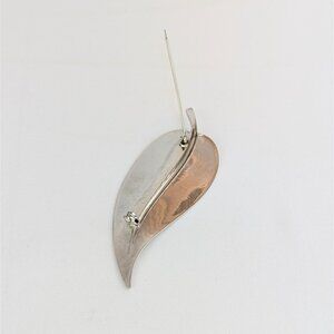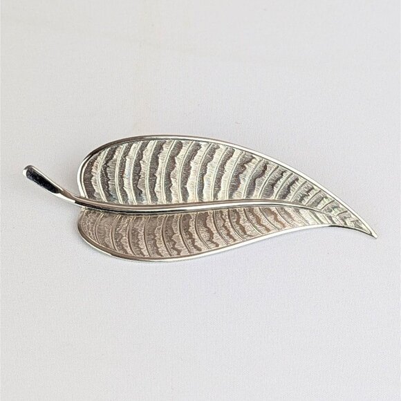This vintage silver-tone brooch captures the beauty of nature with its slender, elongated leaf design, perfect for adding an elegant touch to any outfit. Measuring 3.5 inches long by 1.25 inches wide, this brooch is a fantastic statement piece for a blazer, coat, or scarf, offering a timeless and sophisticated look.