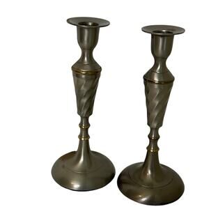 silver tone candlesticks pair, twisted metal candle holders, spiral taper holders, vintage silver candlesticks, gold accent candle set, decorative taper holders, weighted base candle holders, classic table décor, mantel candle holders, twisted stem taper holders
